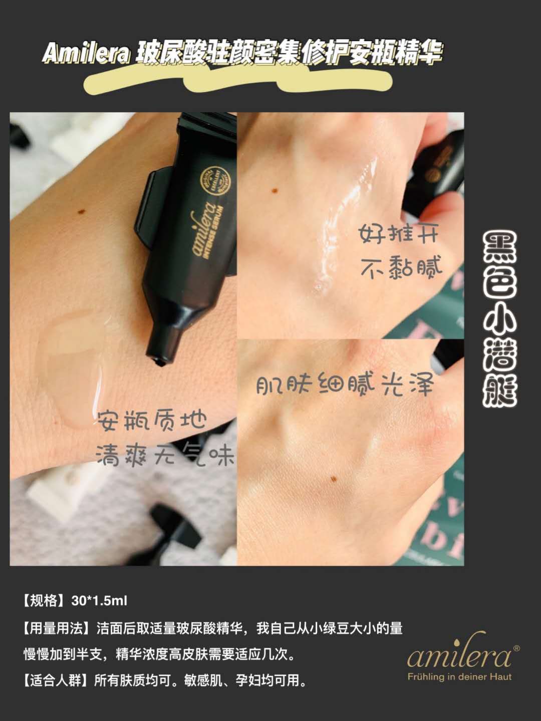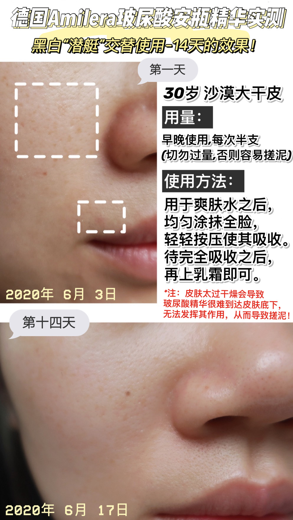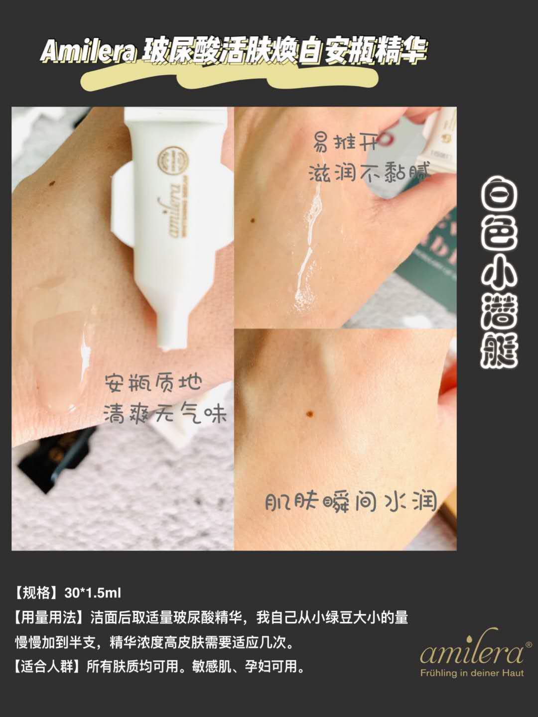 需要特别强调的是,Amilera玻尿酸安瓶为高浓度精华,需严格遵循正确使用方法,从少量开始使用,待皮肤适应精华浓度后,逐步增加用量,避免皮肤吸收不完,浪费营养。